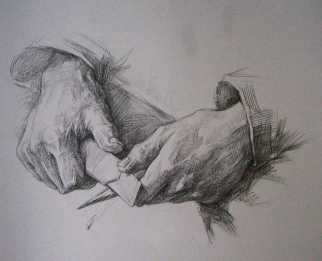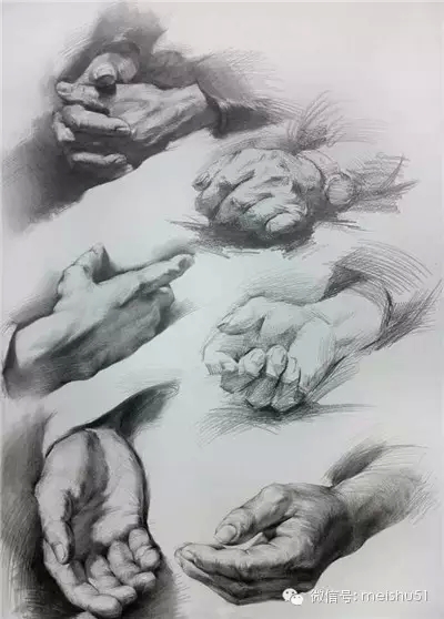 雙手的組合表現(xiàn)相對(duì)單手來(lái)講,刻畫難度更大、復(fù)雜程度也更高,所以一定要將基礎(chǔ)打扎實(shí),熟練掌握手部基礎(chǔ)知識(shí)。觀察時(shí)要把復(fù)雜的手部變化概括、簡(jiǎn)化,可將其看成是幾個(gè)幾何形體的組合。同時(shí)還要注意由于兩只手的相互疊壓、穿插所產(chǎn)生的透視變化。