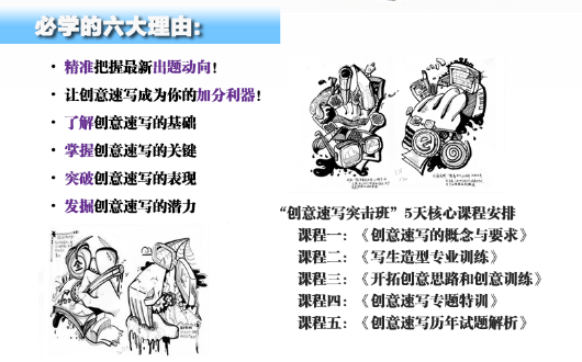 雖然創(chuàng)意速寫難度不大,但是要求的質(zhì)量很高,和傳統(tǒng)的速寫相比,他更加靈活,尤其是對于創(chuàng)意方面的要求很高。所以,如果有參加了創(chuàng)意速寫突擊班,那么你在考試之前就已經(jīng)先人一步!快來報名參加吧!