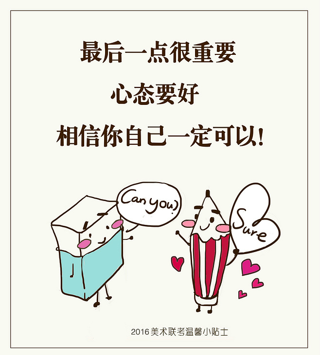 合理安排作畫(huà)時(shí)間,拿到考卷,根據(jù)作畫(huà)的內(nèi)容合理的評(píng)估自己的每步作畫(huà)的大概時(shí)間,同時(shí)不要因?yàn)閯e人的作畫(huà)時(shí)間受影響。