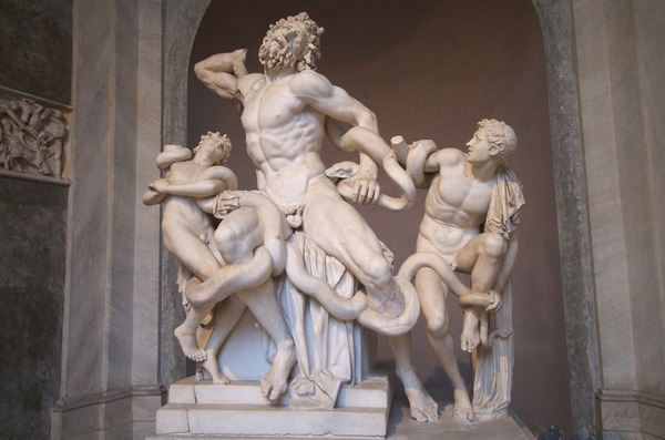 另一個非常著名的展品就是《拉奧孔群雕》。拉奧孔是特洛伊的祭司,當(dāng)時希臘軍隊久攻不下特洛伊,就假意撤軍留下了巨型的木馬。拉奧孔警告他的同胞們“不要相信這木馬,即使希臘人帶著禮物來,我也怕他們。”(這句名言后來演變成一句諺語,就像是我們的俗語-黃鼠狼給雞拜年。)但是狂妄的特洛伊人沒有聽從拉奧孔的勸告,將藏有希臘士兵的木馬拉進(jìn)了城。支持希臘的雅典娜,派出巨蟒殺死了拉奧孔和他的兩個兒子,這組群雕表現(xiàn)的就是巨蟒纏死拉奧孔父子的情景。