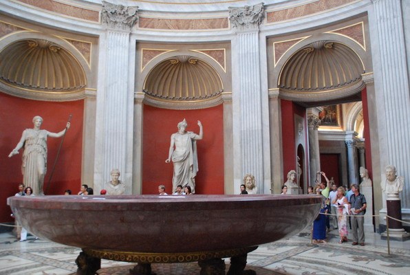 接下來讓我們來看一下圓形的展廳,它是庇護克萊門蒂諾博物館的一部分,名字就叫圓形展廳。展廳正中擺放著一個直徑4.76米的大圓盆,據(jù)說是尼祿皇帝的浴盆。它是由一整塊紫色云石制成,非常奢侈華麗。