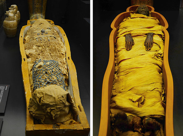 首先進(jìn)入的是埃及館,我們看到木乃伊就躺在敞開的棺墓中,不知道用了什么樣的方法,經(jīng)過了幾千年,面部和手腳都清晰地呈現(xiàn)在我們眼前。