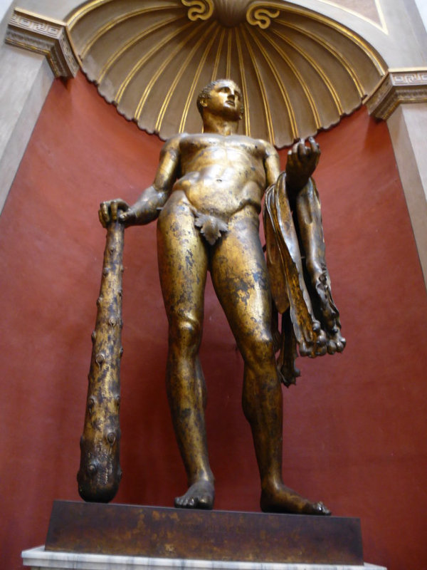 大廳四周的壁龕里擺著十尊雕像,其中最顯眼的一尊金色的是古希臘神話中宙斯的兒子大力神赫拉克勒斯。我們看到的這尊雕像是赫拉克勒斯左手拿著獅子皮右手握著打獅棒的樣子。