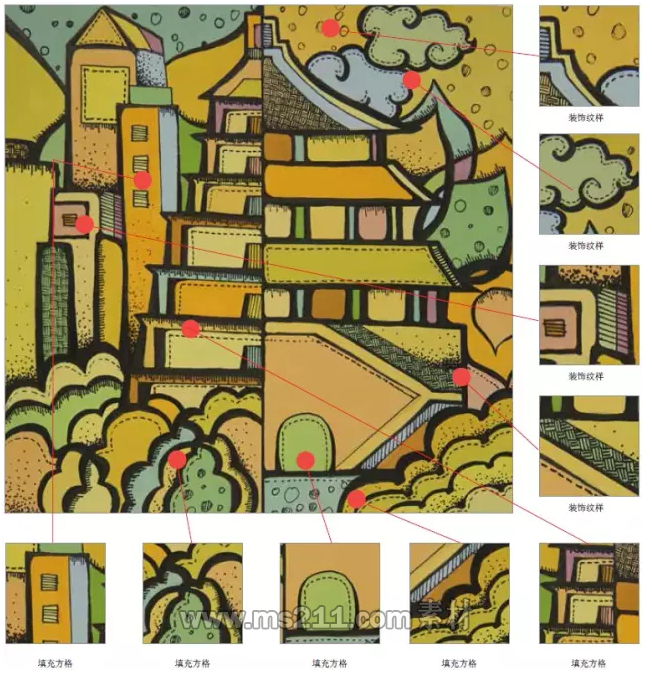 肌理裝飾是指在一個面(色塊)上畫出各種紋理來裝飾這個色塊的技法。此用法非常普遍,不僅簡單實用,還能取得很好的畫面效果。