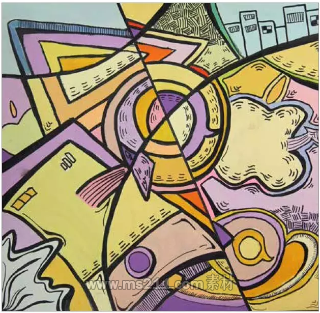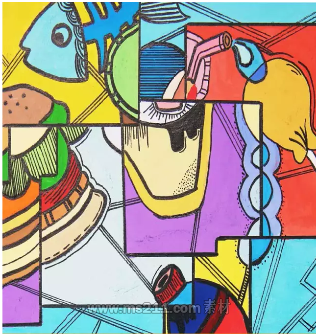 將畫面分割為幾個部分,使物體產(chǎn)生錯位的感覺,也是彩色裝飾畫常用的技法。這是一種把物體打散重組的方法,這是解構(gòu)意識的體現(xiàn)。