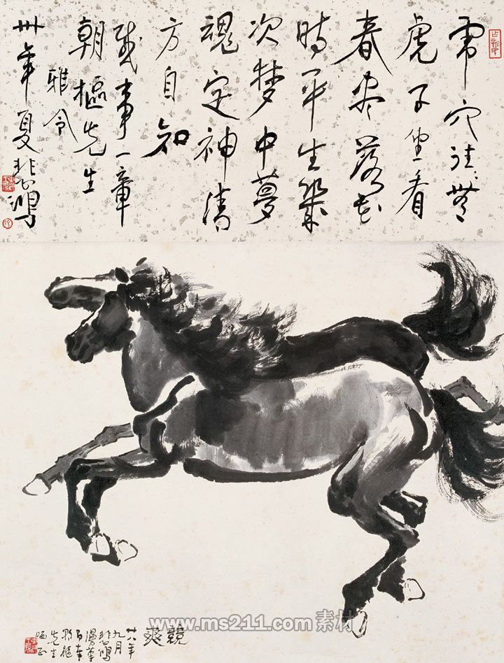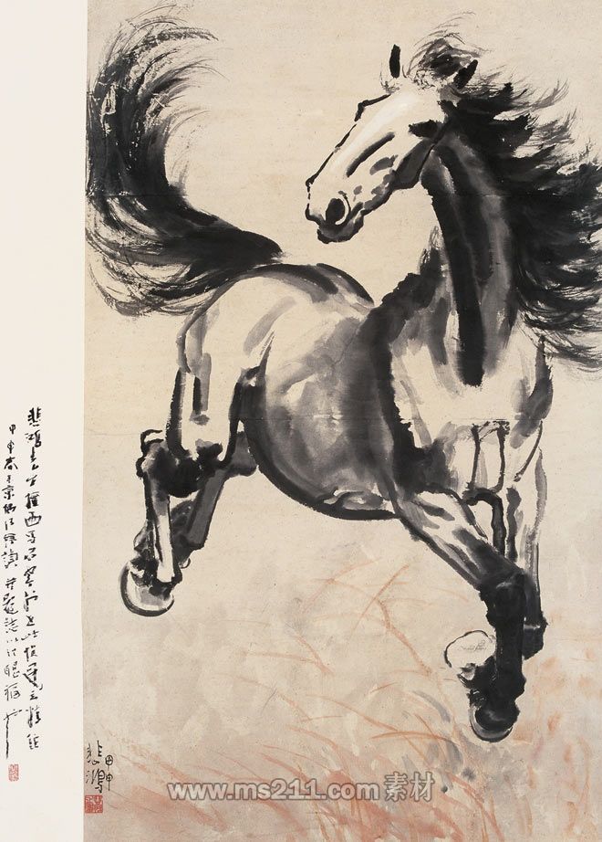 徐悲鴻出身貧寒,自幼隨父親徐達(dá)章學(xué)習(xí)詩文書畫。1912年17歲時(shí)便在宜興女子初級師范等學(xué)校任圖畫教員。1916年入上海復(fù)旦大學(xué)法文系半工半讀,并自學(xué)素描。1917年留學(xué)日本學(xué)習(xí)美術(shù),不久回國,任北京大學(xué)畫法研究會(huì)導(dǎo)師,并兼職于孔德學(xué)院。1919年赴法國留學(xué),考入巴黎國立美術(shù)學(xué)校學(xué)習(xí)油畫、素描,并游歷西歐諸國,觀摩研究西方美術(shù)。1927年回國,先后任上海南國藝術(shù)學(xué)院美術(shù)系主任、、中央大學(xué)藝術(shù)系教授、北京大學(xué)藝術(shù)學(xué)院院長。1933年起,先后在法國、比利時(shí)、意大利、英國、德國、蘇聯(lián)舉辦中國美術(shù)展覽和個(gè)人畫展??谷諔?zhàn)爭爆發(fā)后,在香港、新加坡、印度舉辦義賣畫展,宣傳支援抗日。后重返中央大學(xué)藝術(shù)系任教。中華人民共和國建立后,任中華全國美術(shù)工作者協(xié)會(huì)(現(xiàn)中國美術(shù)家協(xié)會(huì))主席、中央美術(shù)學(xué)院院長等職,為第一屆全國政協(xié)代表。徐悲鴻的作品熔古今中外技法于一爐,顯示了極高的藝術(shù)技巧和廣博的藝術(shù)修養(yǎng),是古為今用、洋為中用的典范,在我國美術(shù)史上起到了承前啟后、繼往開來的巨大作用。他擅長素描、油畫、中國畫。他把西方藝術(shù)手法融入到中國畫中,創(chuàng)造了新穎而獨(dú)特的風(fēng)格。他的素描和油畫則滲入了中國畫的筆墨韻味。他的創(chuàng)作題材廣泛,山水、花鳥、走獸、人物、歷史、神話,無不落筆有神,栩栩如生。他的代表作油畫《田橫五百士》、《徯我后》、中國畫《九方皋》、《愚公移山》等巨幅作品,充滿了愛國主義情懷和對勞動(dòng)人民的同情,表現(xiàn)了人民群眾堅(jiān)韌不拔的毅力和威武不屈的精神,表達(dá)了對民族危亡的憂憤和對光明解放的向往。他常畫的奔馬、雄獅、晨雞等,給人以生機(jī)和力量,表現(xiàn)了令人振奮的積極精神。尤其他的奔馬,更是馳譽(yù)世界,幾近成了現(xiàn)代中國畫的象征和標(biāo)志。徐悲鴻長期致力于美術(shù)教育工作。他發(fā)現(xiàn)和團(tuán)結(jié)了眾多的美術(shù)界著名人士。他培養(yǎng)的學(xué)生中人材輩出,許多已成為著名的藝術(shù)家,成為中國美術(shù)界的中堅(jiān)骨干。他對中國美術(shù)隊(duì)伍的建設(shè)和中國美術(shù)事業(yè)的發(fā)展作出的卓越貢獻(xiàn),無與倫比,影響深遠(yuǎn)。