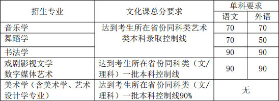 美術(shù)學(xué)(含美術(shù)學(xué)、藝術(shù)設(shè)計(jì)學(xué)專業(yè)):高考文化課成績(jī)不低于考生所在省份同科類普通本科一批錄取控制線(合并一、二本招生的省份及上海市為自主招生參考線,浙江為一段線)90%。