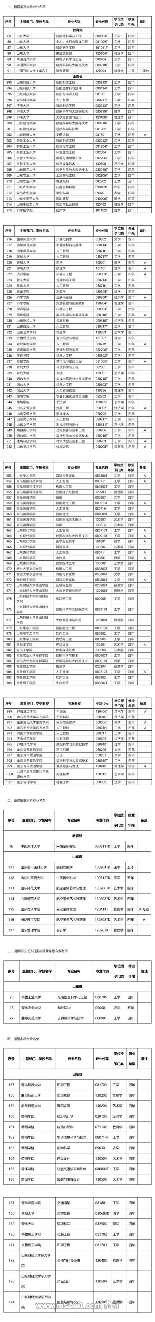據(jù)統(tǒng)計,此次新增本科專業(yè)名單中,三所駐魯部屬高校——山東大學(xué)中國海洋大學(xué)中國石油大學(xué)(華東),新增7個備案專業(yè)、1個審批專業(yè);山東省屬高校中,49所高校新增備案本科專業(yè)109個;7所高校各新增審批本科專業(yè)1個;8所高校撤銷本科專業(yè)18個。此外,3所省屬高校調(diào)整學(xué)位授予門類或修業(yè)年限本科專業(yè)3個。