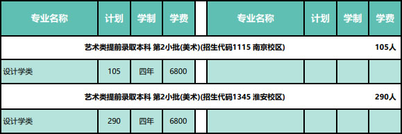 備注:淮安校區(qū)設(shè)計學類含視覺傳達設(shè)計、環(huán)境設(shè)計、環(huán)境設(shè)計(室內(nèi)設(shè)計)、產(chǎn)品設(shè)計等4個專業(yè),僅面向江蘇省招生,采用“2+2”培養(yǎng)模式:一、二年級學生在淮安校區(qū)學習,三、四年級學生在南京校區(qū)學習。。南京校區(qū)設(shè)計學類含視覺傳達設(shè)計、環(huán)境設(shè)計、環(huán)境設(shè)計(室內(nèi)設(shè)計)、公共藝術(shù)、數(shù)字媒體藝術(shù)、產(chǎn)品設(shè)計等6個專業(yè)。