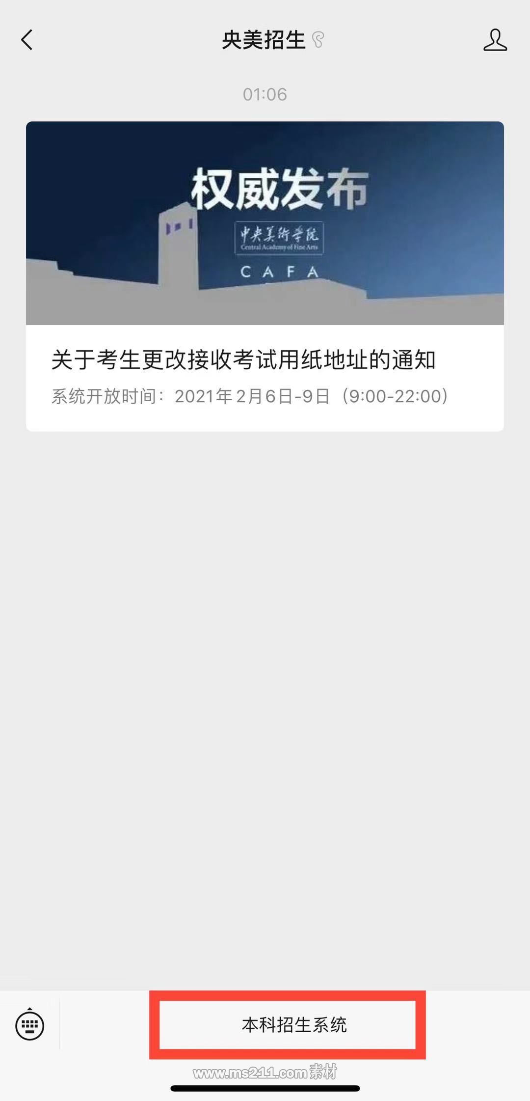 受疫情防控影響,部分考生接收考試用紙地址發(fā)生變更??荚囉眉埥邮盏刂沸枰牡目忌?,務(wù)必于2021年2月9日22:00前,通過“央美招生”微信公眾號進(jìn)入本科招生系統(tǒng),在“我的”-“通訊地址”中更改。本次更改除通訊地址信息外,其他信息不能修改。