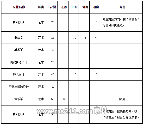 安徽考生報(bào)考舞蹈表演專業(yè)時(shí),須根據(jù)專業(yè)方向參加全省藝術(shù)類專業(yè)相應(yīng)模塊的統(tǒng)考,體育舞蹈、健美操方向按“模塊三”綜合分從高到低擇優(yōu)錄取,專業(yè)舞蹈方向按“模塊四”綜合分從高到低擇優(yōu)錄取。