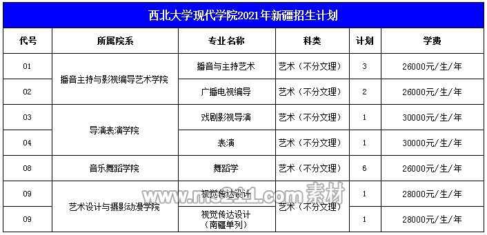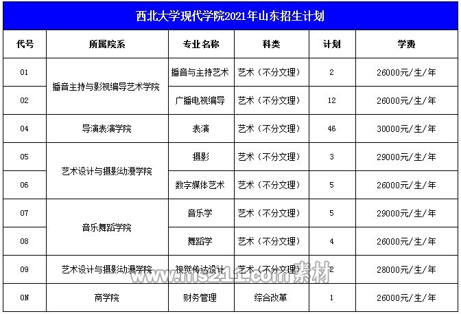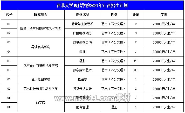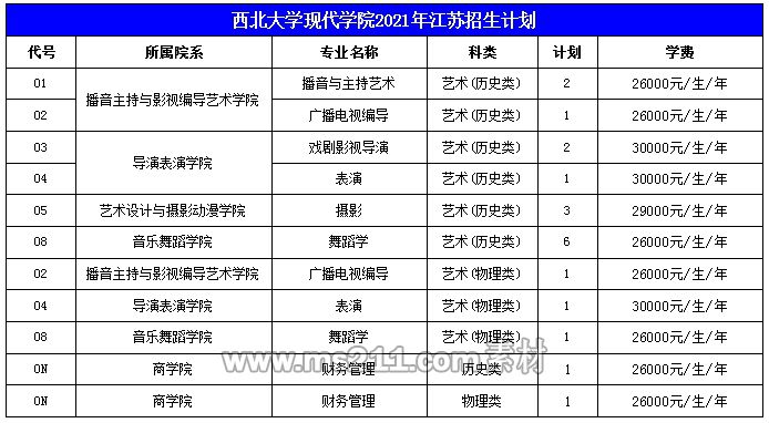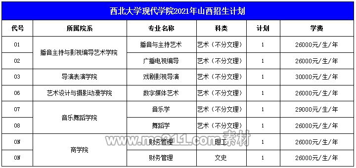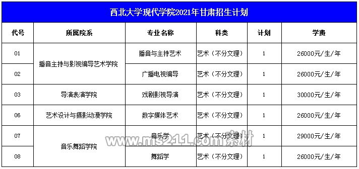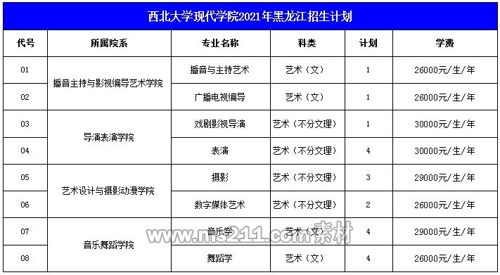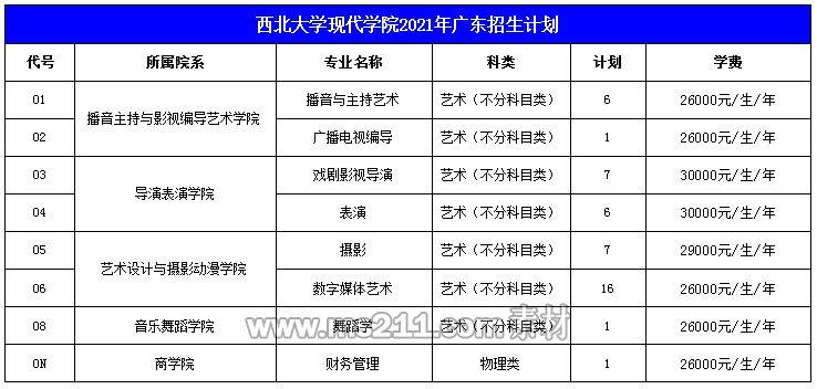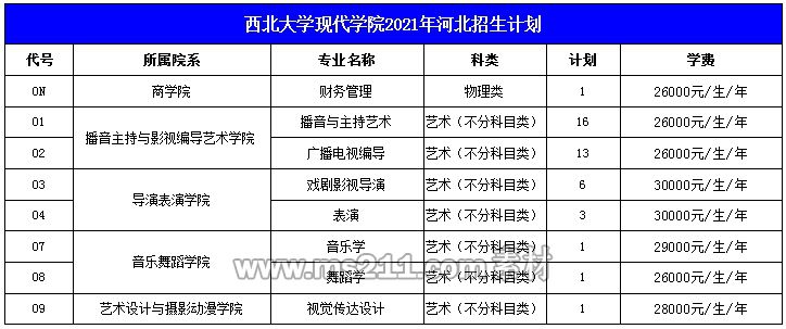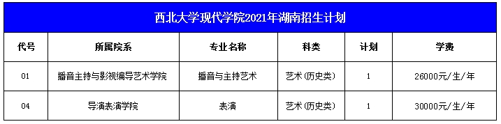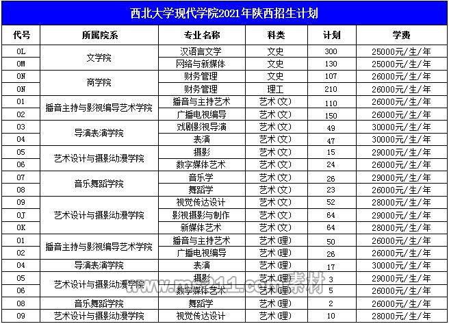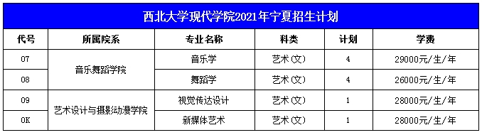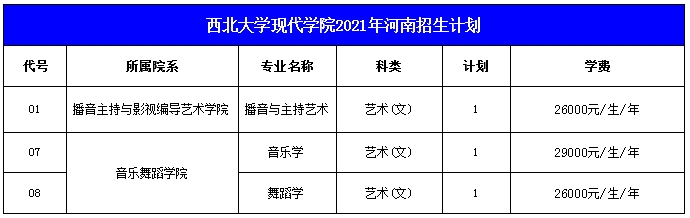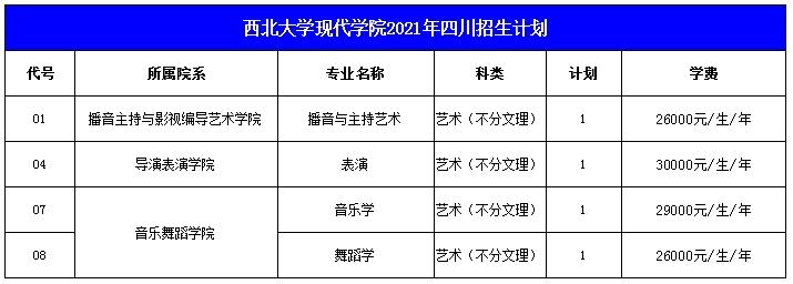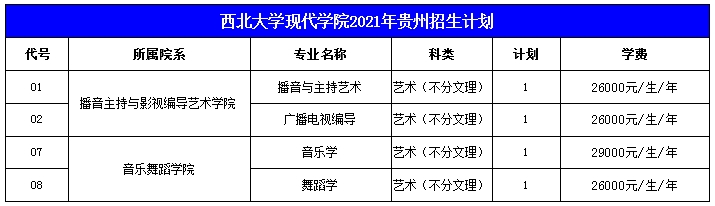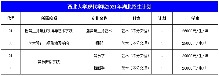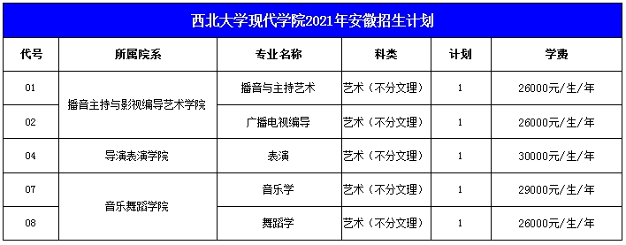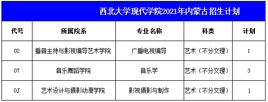 2021年西北大學現(xiàn)代學院藝術(shù)類本科專業(yè)招生計劃