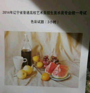 色彩:一塊白布,一個(gè)白盤(pán)子放兩塊西瓜,一個(gè)玻璃碗里放了一個(gè)橘子一個(gè)蘋(píng)果,一串葡萄,,一個(gè)透明玻璃瓶子里裝了半瓶葡萄酒,還有兩個(gè)梨和一個(gè)橘子