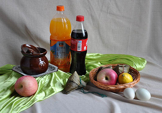 三、模擬寫生內(nèi)容:一瓶橙汁,一瓶可樂(lè),一個(gè)帶蓋的陶罐,一個(gè)瓷盤,一個(gè)柳編盤,兩個(gè)蘋果,三個(gè)粽子,一個(gè)檸檬,兩個(gè)鴨蛋,一塊綠色襯布、一塊淺色襯布。(見圖片小樣)
