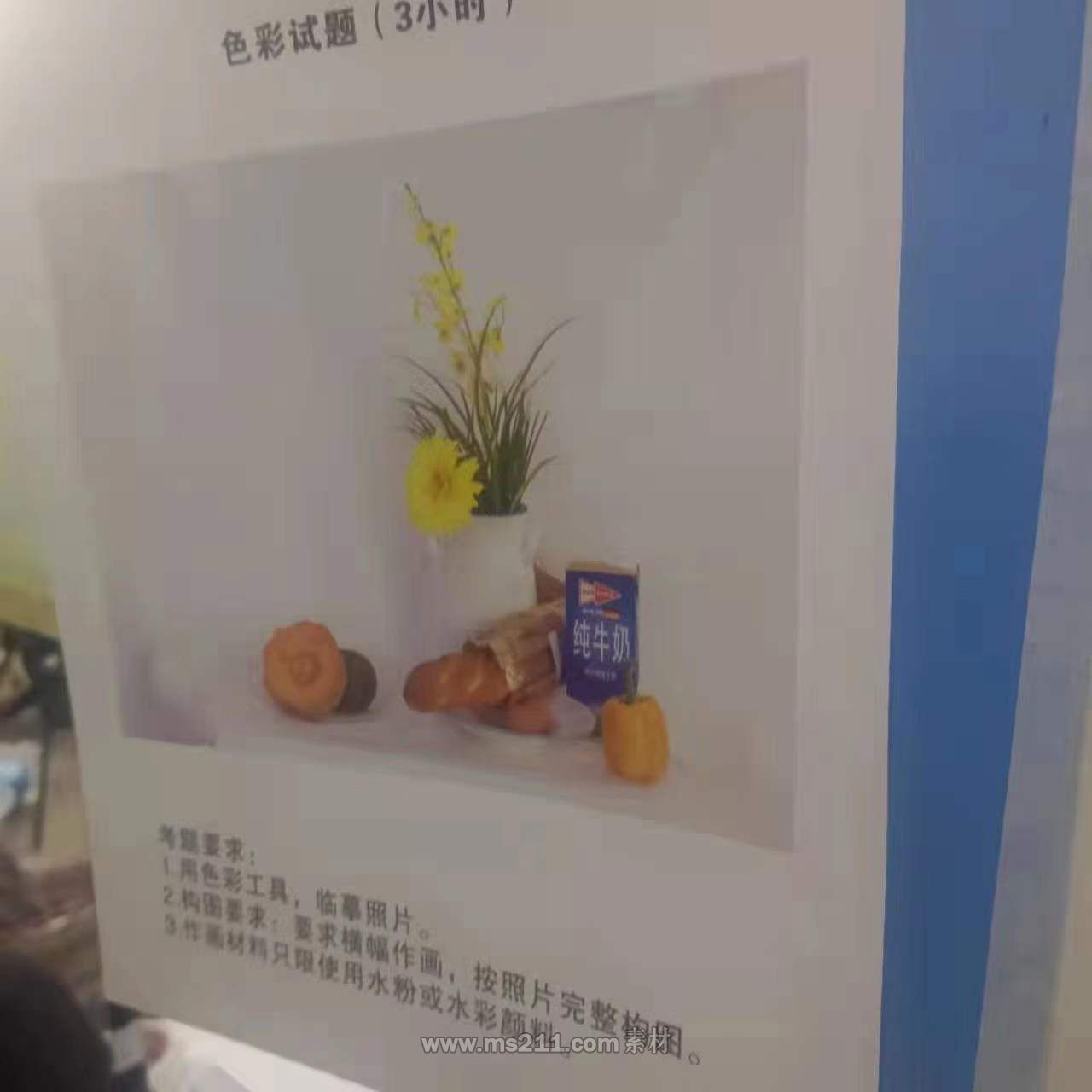 色彩考題:靜物組合,一個插著鮮花的白色花瓶,一盒裝牛奶,切開的南瓜,1個黃彩椒等