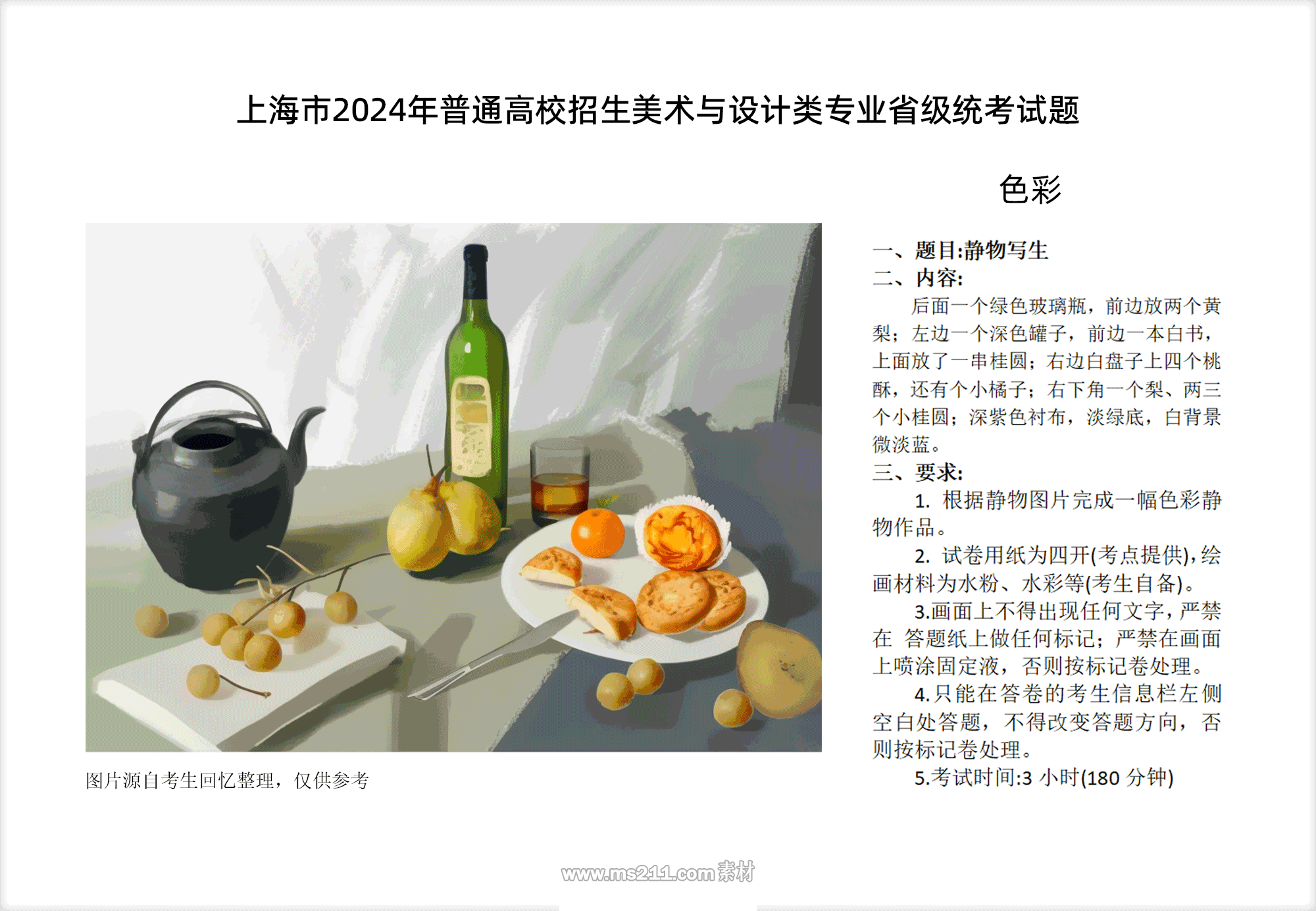 考試題目:靜物組合(照片模擬寫生),最后面一個綠色玻璃酒瓶子前邊放倆黃梨,左邊一個深色罐子前邊一本白書上邊放了一串桂圓,右邊白盤子上四個桃酥堆著放還有個小橘子,右下角一個梨、兩三個小桂圓,深紫色襯布,淡綠底,白背景微淡藍(lán)。