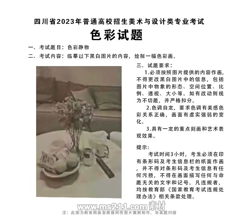 色彩考題:靜物,花卉、玻璃瓶、玻璃杯、盤子、水果等等,背景是沙發(fā),類似于客廳的場景。  考試時間:180分鐘  考試分值:100分 ...