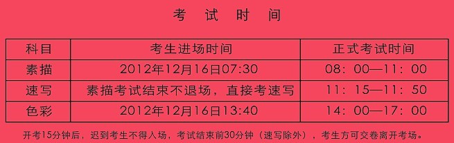 3.請于2012年12月16日上午7:30前,攜帶本人二代《身份證》、《準考證》及畫具準時到所在考場參加考試。