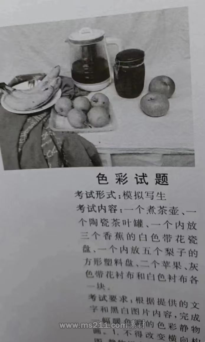 色彩考題:模擬寫生。一個白色瓷盤六個石榴(其中五個放置瓷盤中)、一個撥浪鼓、兩顆紫葡萄、深色和白色襯布各一塊。