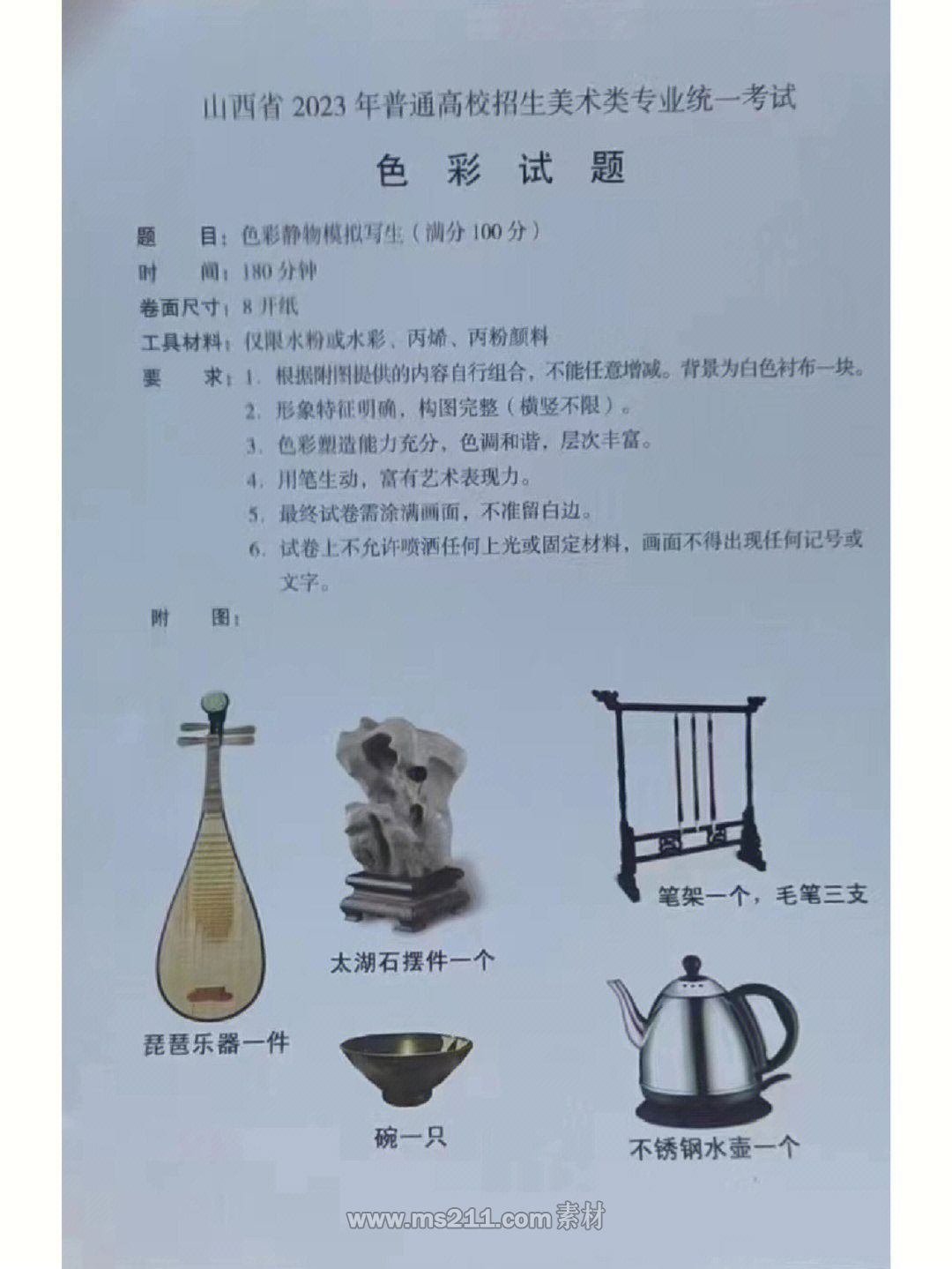 色彩考題:靜物模擬寫生,琵琶樂器一把、太湖石擺件一個、筆架一個(掛三支毛筆)、碗一只、不銹鋼水壺一個。