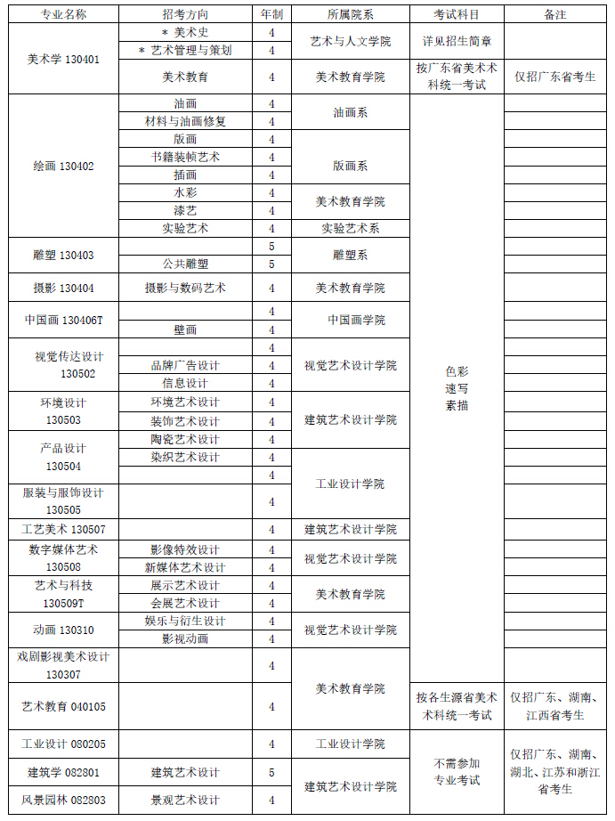* 注:考生報考我校美術(shù)學(美術(shù)史)、美術(shù)學(藝術(shù)管理與策劃)專業(yè),不需參加色彩、速寫、素描三科???,具體報考辦法、考試科目和考試要求將在我校正式公布的招生簡章中詳細說明。