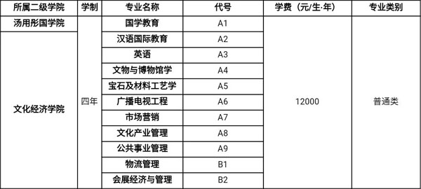學(xué)校設(shè)有音樂舞蹈學(xué)院、美術(shù)與設(shè)計學(xué)院、傳媒學(xué)院、文化經(jīng)濟學(xué)院、職業(yè)教育學(xué)院、思政與公共課教育學(xué)院、湯用彤國學(xué)院、中國書法篆刻學(xué)院;現(xiàn)有本科專業(yè)37個,專科專業(yè)21個?,F(xiàn)有全日制本、??圃谛I?2500人。
