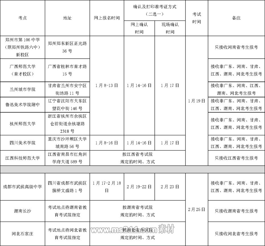 1、除美術(shù)學(xué)專業(yè)(美術(shù)史、藝術(shù)管理與策劃培養(yǎng)方向)、書法學(xué)專業(yè),其他各美術(shù)類校考專業(yè)在廣東省外的考點安排如下: