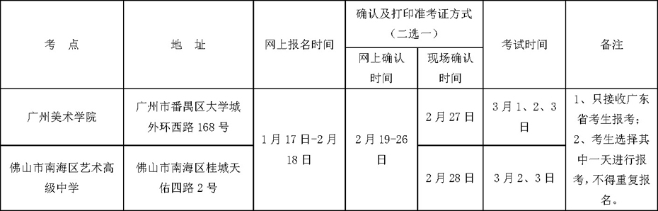 2、除美術(shù)學(xué)專業(yè)(美術(shù)史、藝術(shù)管理與策劃培養(yǎng)方向)、書法學(xué)專業(yè),其他各美術(shù)類??紝I(yè)在廣東省內(nèi)的考點安排如下: