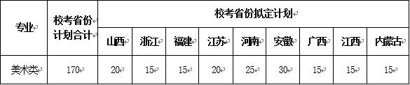 我校2018年美術(shù)類專業(yè)擬在湖南、山西、浙江、福建、江蘇、河南、安徽、廣西、江西、內(nèi)蒙古等省份招生。??际》輸M定計劃見下表,湖南等承認省統(tǒng)考成績省份招生計劃另行公布,具體招生計劃詳見各?。▍^(qū)、市)2018年招生計劃來源表。