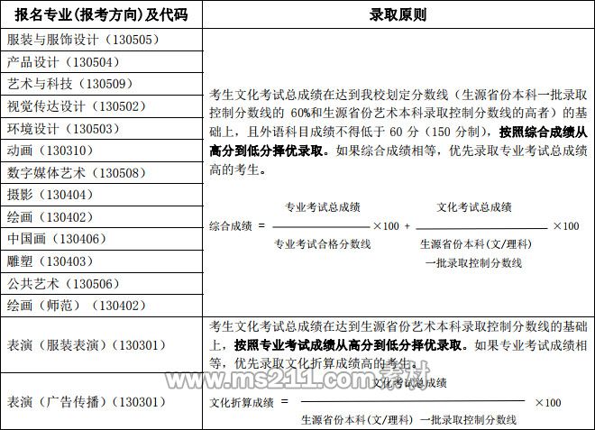 考生須符合生源省份藝術(shù)類報考條件、錄取規(guī)定,取得省級藝術(shù)類專業(yè)統(tǒng)考相應(yīng)專業(yè)本科合格資格(省統(tǒng)考未涉及到的專業(yè)除外)及我校專業(yè)考試合格資格,并且高考填報志愿須與我校??己细竦膶I(yè)一致。各專業(yè)按照以下原則錄?。?/p>
