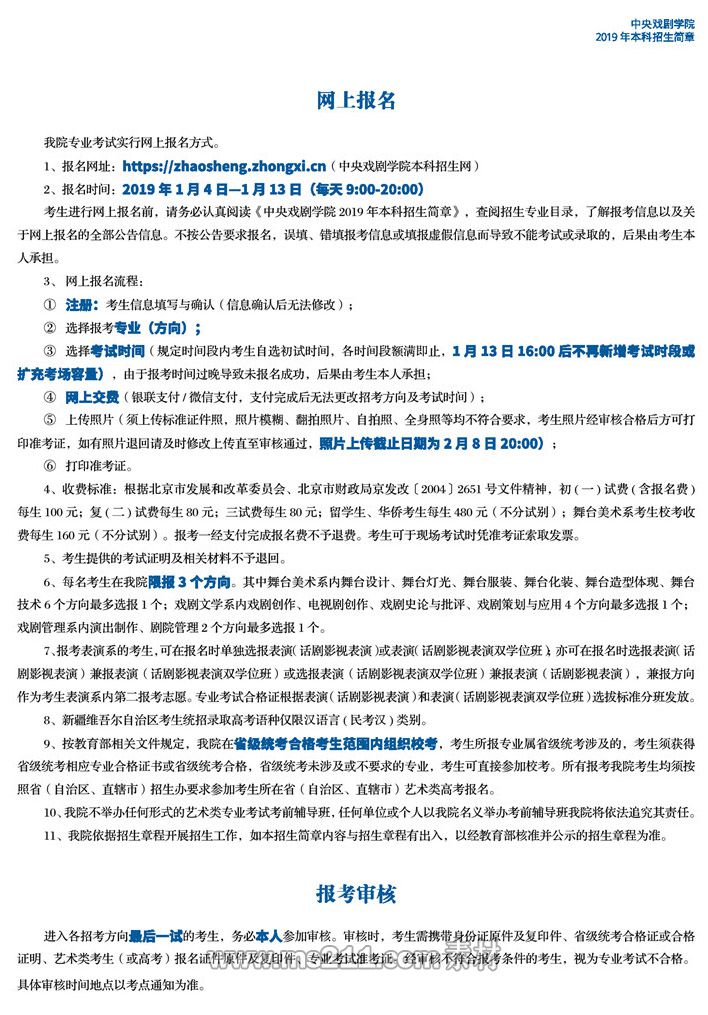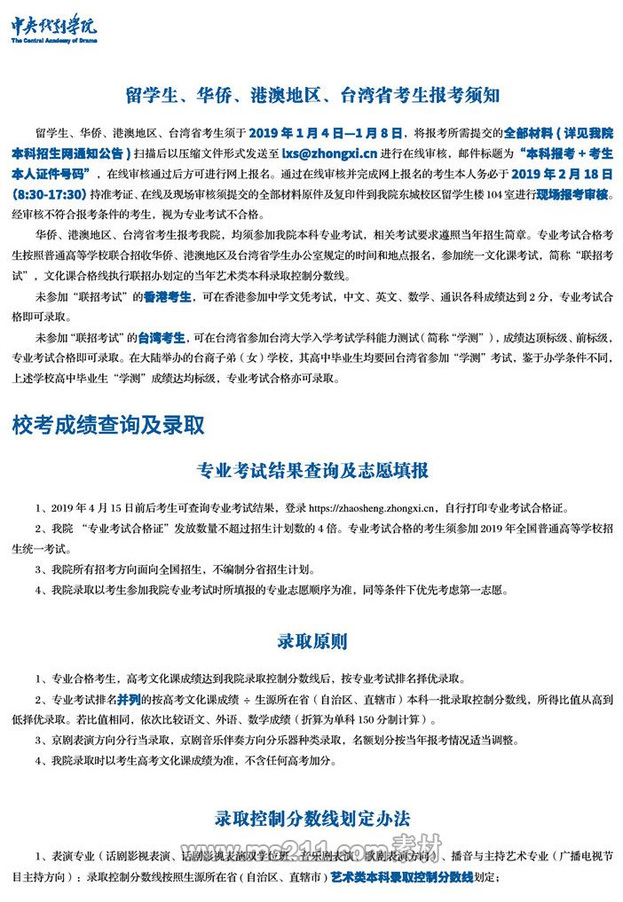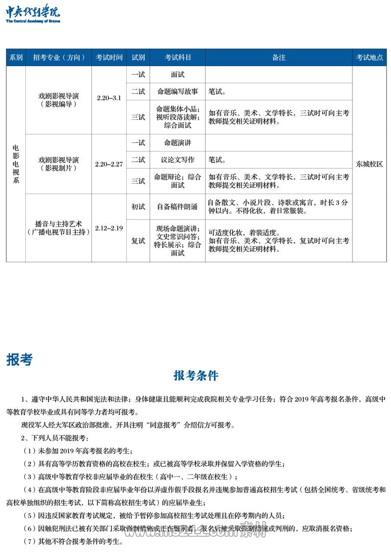 中央戲劇學(xué)院2019年本科招生簡章