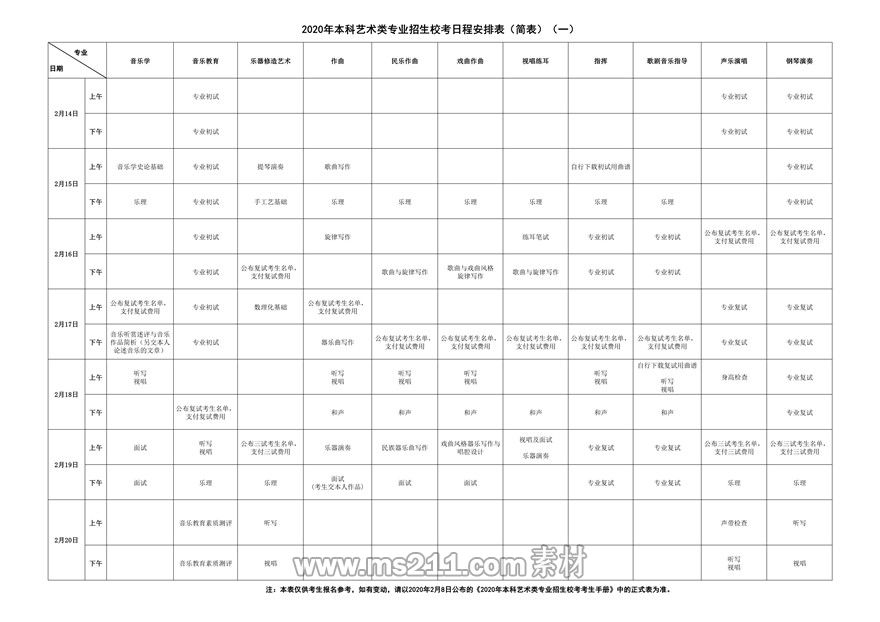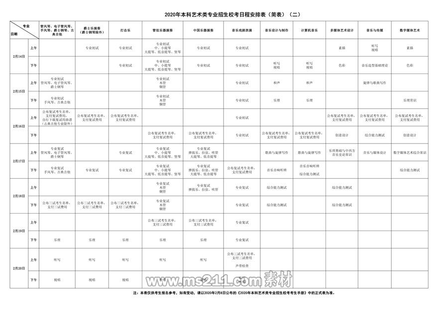 上海音樂學(xué)院2020年本科藝術(shù)類專業(yè)招生??既粘贪才疟?簡版)