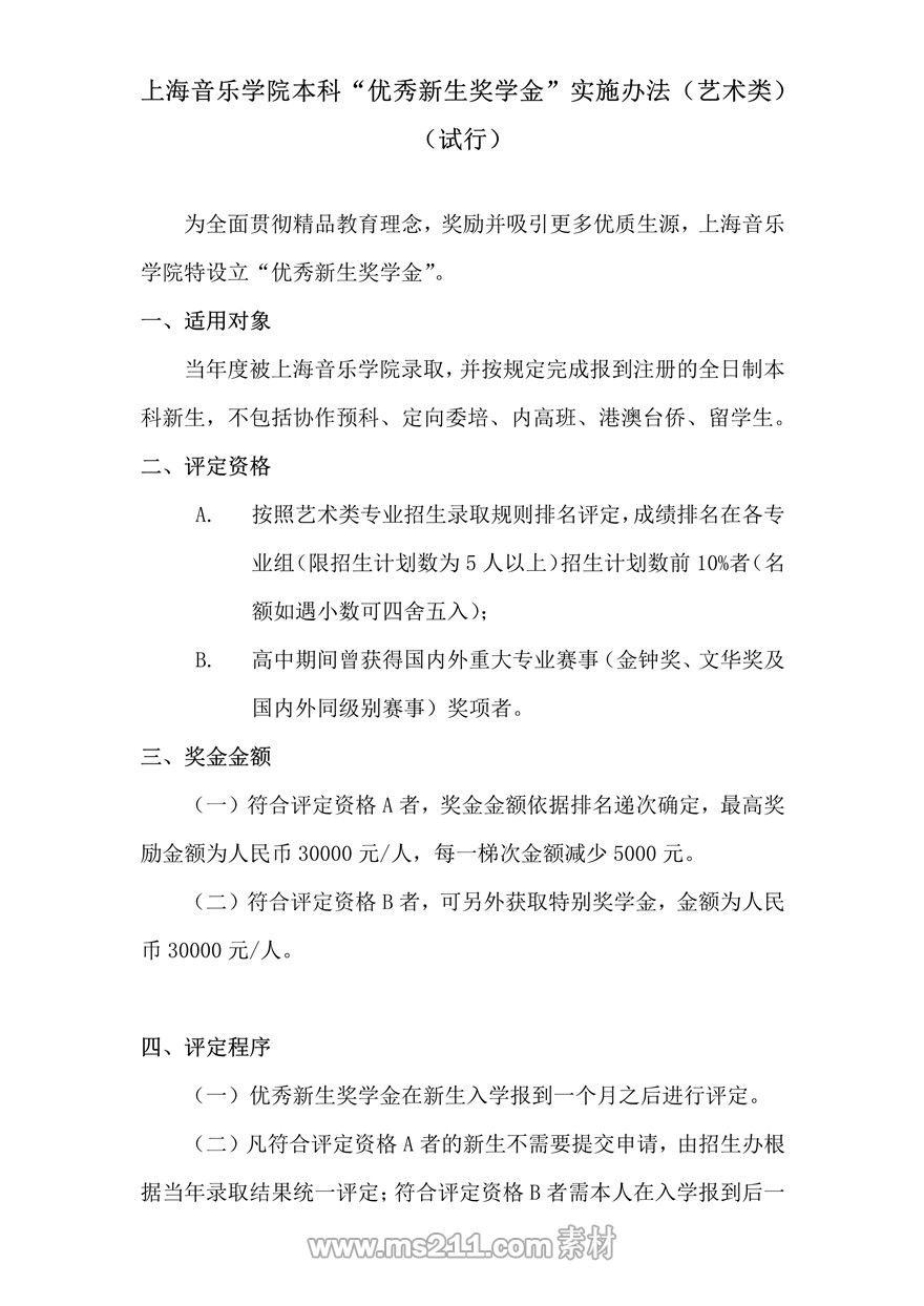 上海音樂學(xué)院本科“優(yōu)秀新生獎學(xué)金”實(shí)施辦法(藝術(shù)類)