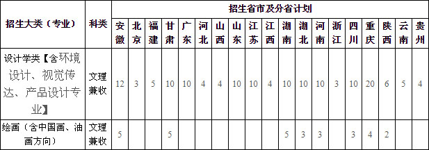 專業(yè)及總計(jì)劃:設(shè)計(jì)學(xué)類(含環(huán)境設(shè)計(jì)、視覺傳達(dá)、產(chǎn)品設(shè)計(jì)專業(yè))150名,繪畫專業(yè)30名。具體招生省市及分省計(jì)劃如下: