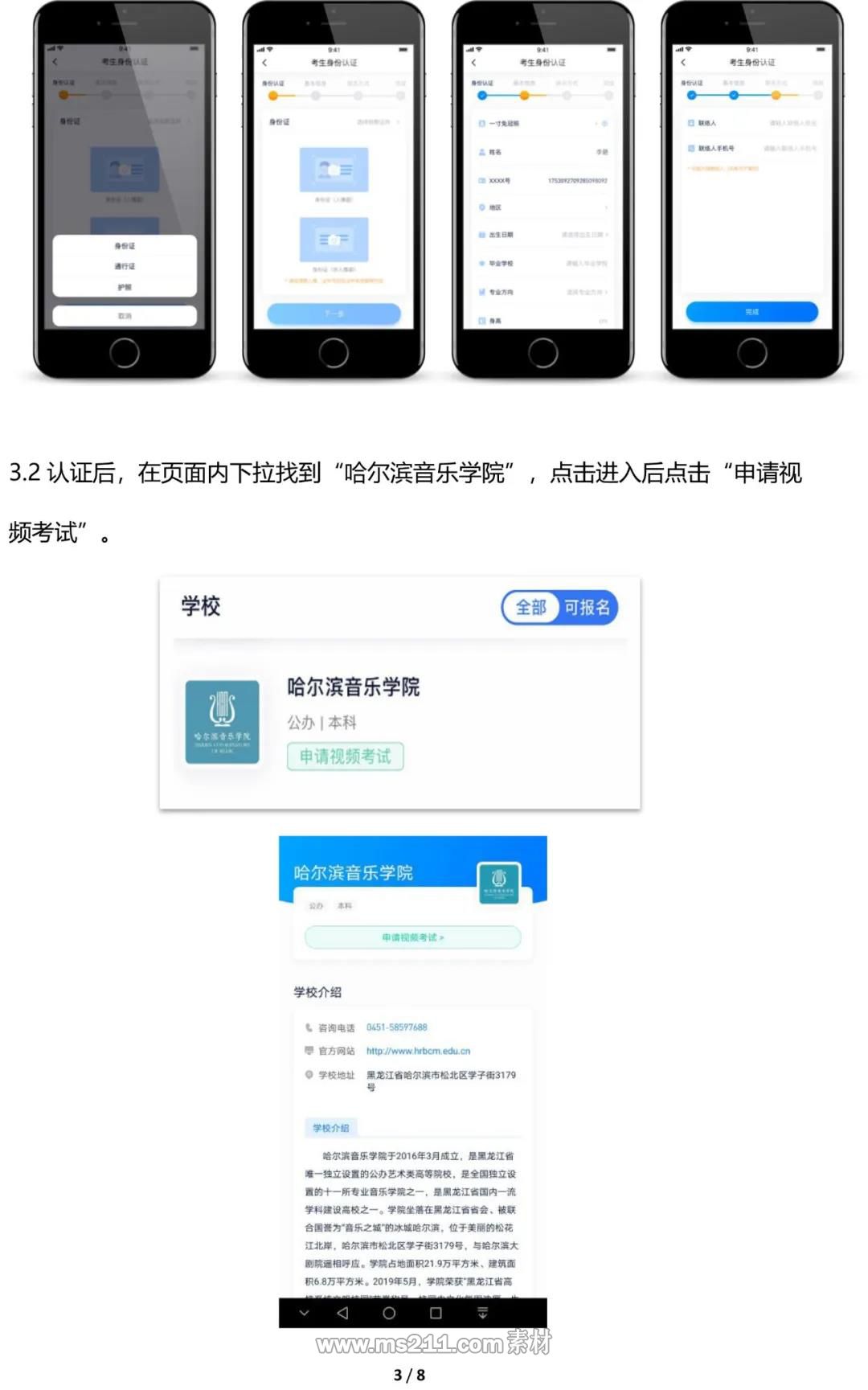 1.已經(jīng)通過“哈爾濱音樂學院教務處微信公眾號”報名成功的考生須用手機下載并安裝初試使用的APP,進行錄制和提交視頻作品,具體操作步驟詳見《哈爾濱音樂學院??汲踉囈曨l作品錄制提交操作說明》(附件)。考生依次在手機APP上進行身份認證、在線申請考試、在線錄制和提交視頻作品。