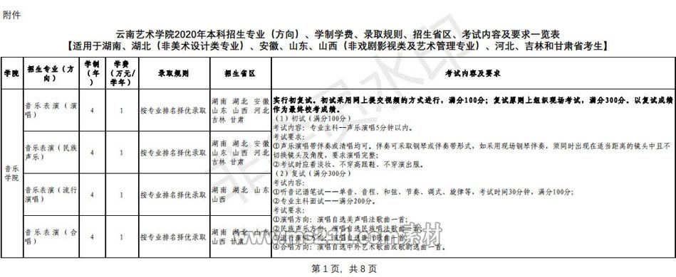 (四)錄取時,根據(jù)考生的高考文化課成績和專業(yè)成績,德、智、體、美全面考核,按各專業(yè)錄取規(guī)則擇優(yōu)錄取(具體錄取辦法詳見《云南藝術(shù)學(xué)院2020年本科招生章程》)。