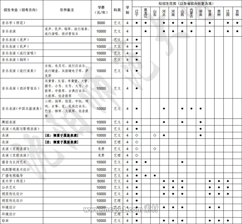 3、我校藝術(shù)類各專業(yè)與各省統(tǒng)考專業(yè)對應(yīng)關(guān)系,詳見教育部“陽光高考信息平臺”。4、我校藝術(shù)類專業(yè)在不分文理的省份文理兼招;在分文理科的省份只招收“藝術(shù)文”;服裝表演、京劇表演、視覺傳達(dá)設(shè)計(jì)、環(huán)境設(shè)計(jì)在遼寧文理兼招。