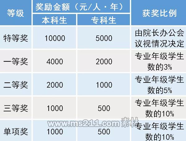 學(xué)校獎學(xué)金的等級、獎勵金額和獲獎比例一覽表