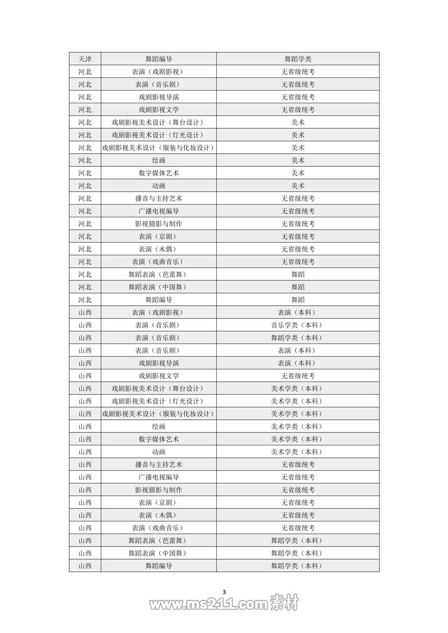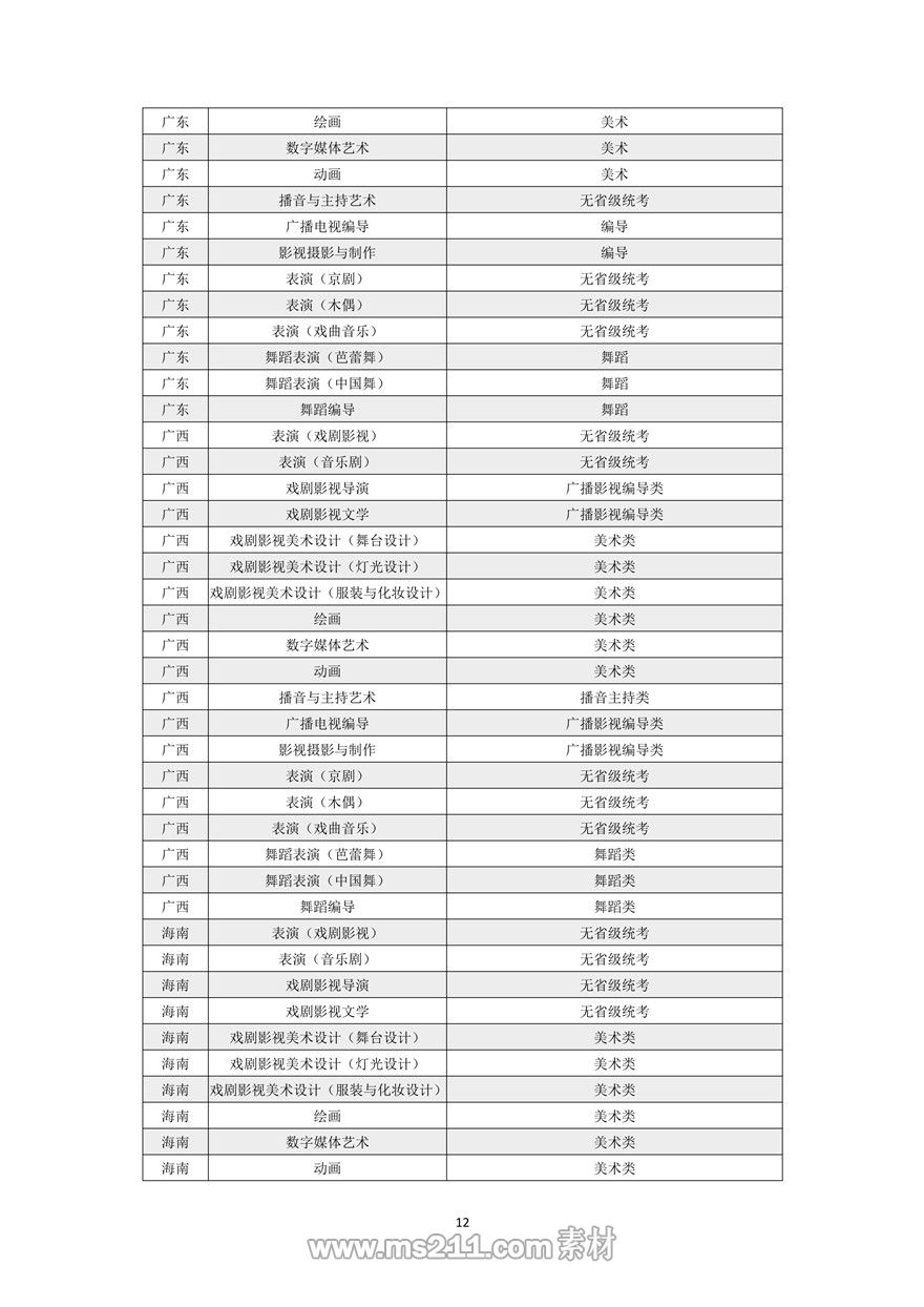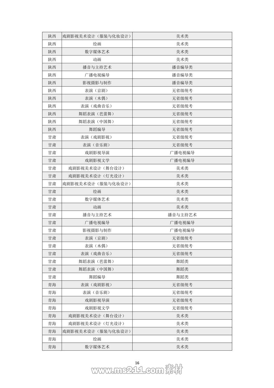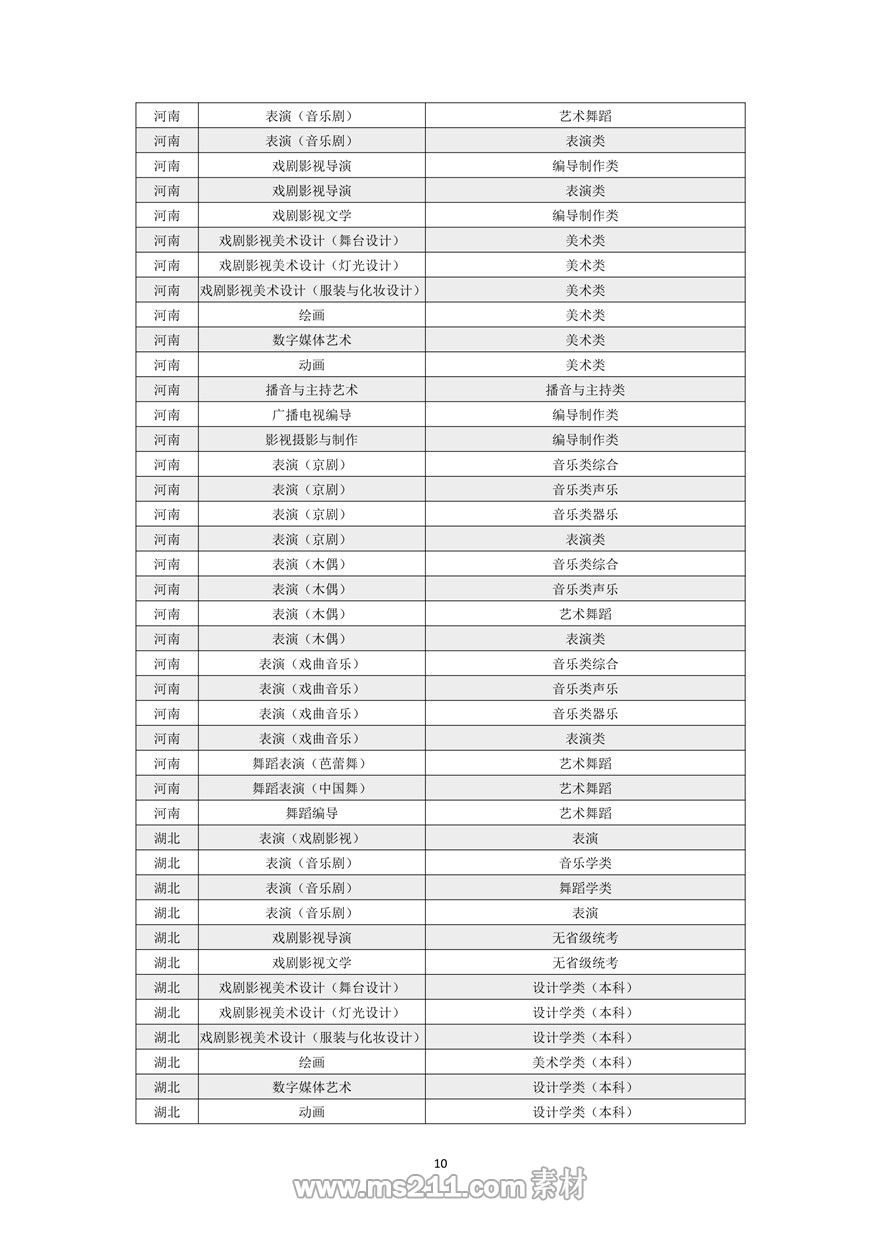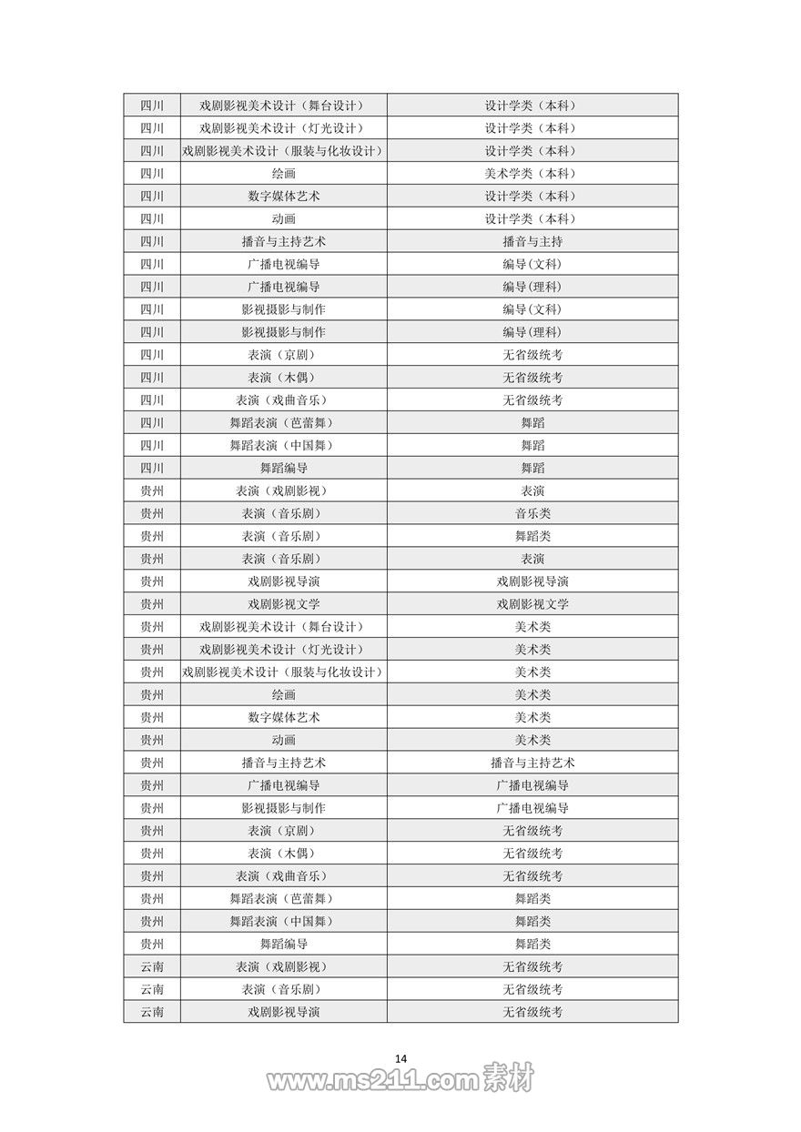 表演(戲劇影視)、表演(音樂劇)、表演(京劇)、表演(戲曲音樂)、表演(木偶)、戲劇影視導(dǎo)演、戲劇影視文學(xué)【含新概念】、戲劇學(xué)、戲劇影視美術(shù)設(shè)計(jì)(舞臺(tái)設(shè)計(jì))、戲劇影視美術(shù)設(shè)計(jì)(燈光設(shè)計(jì))、戲劇影視美術(shù)設(shè)計(jì)(服裝與化妝設(shè)計(jì))、繪畫、數(shù)字媒體藝術(shù)、動(dòng)畫、藝術(shù)管理、播音與主持藝術(shù)、廣播電視編導(dǎo)、影視攝影與制作、舞蹈表演(芭蕾舞)、舞蹈表演(中國(guó)舞)、舞蹈編導(dǎo)。