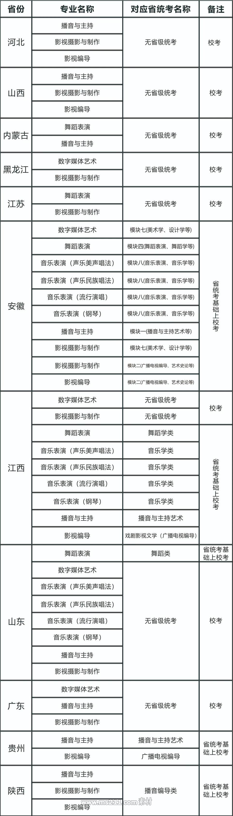 2021年藝術(shù)類校考專業(yè)與各省級(jí)統(tǒng)考對(duì)應(yīng)關(guān)系一覽表