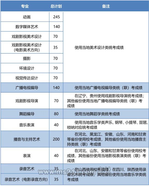3.戲劇影視導(dǎo)演專業(yè)在遼寧、貴州使用戲劇影視導(dǎo)演統(tǒng)考成績(jī),其他省份使用當(dāng)?shù)貜V播電視編導(dǎo)類統(tǒng)(聯(lián))考成績(jī)。平行志愿投檔的省份按投檔成績(jī)由高到低錄取;非平行志愿投檔的省份按進(jìn)檔考生高考文化成績(jī)由高到低錄取。