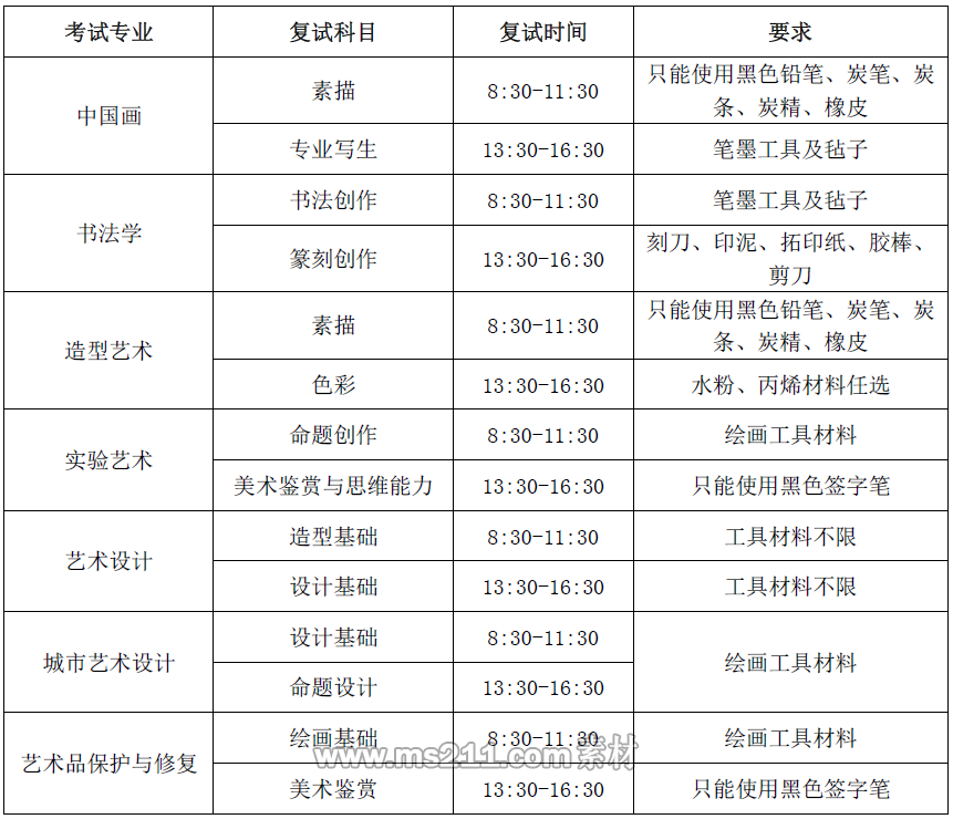 第十五條 中國畫、書法學(xué)、造型藝術(shù)、實(shí)驗(yàn)藝術(shù)、藝術(shù)設(shè)計(jì)、城市藝術(shù)設(shè)計(jì)和藝術(shù)品保護(hù)與修復(fù)專業(yè)考試分為線上初試和現(xiàn)場(chǎng)復(fù)試兩個(gè)環(huán)節(jié)。