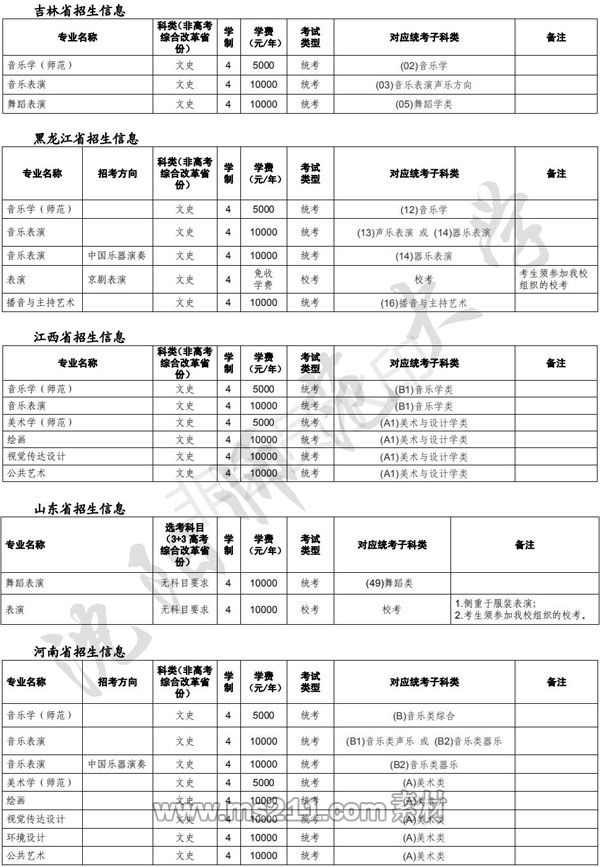 我校藝術(shù)類專業(yè)2021年擬在河北、山西、內(nèi)蒙、吉林、黑龍江、江西、山東、河南、湖南、貴州、甘肅等省份招生。各省具體的招生專業(yè)、招生計(jì)劃、對(duì)應(yīng)統(tǒng)考子科類等以各省招考辦公布為準(zhǔn)。學(xué)費(fèi)標(biāo)準(zhǔn)按遼寧省發(fā)展和改革委員會(huì)政策適時(shí)浮動(dòng)。