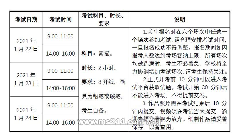 2021年1月10日8:00—18日20:00,在藝術(shù)升APP上進行報名、繳費;1月15日8:00—19日20:00,在報名系統(tǒng)對報考信息進行在線確認,確認后方可打印準考證。