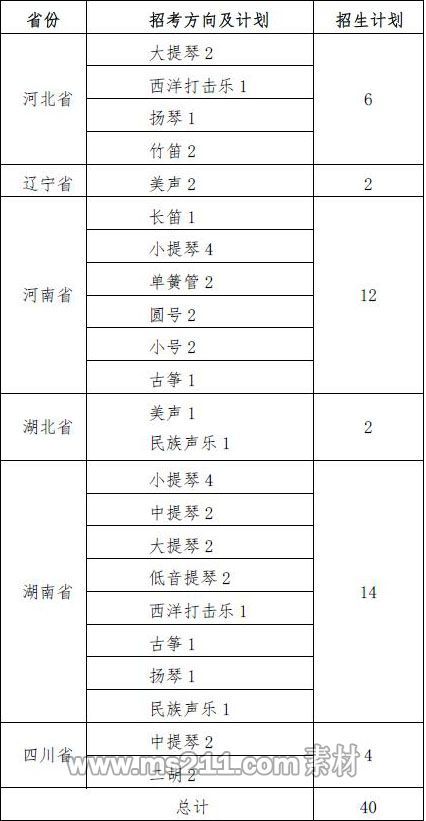 我校根據(jù)藝術(shù)學(xué)院專業(yè)需求及各省份藝術(shù)小項(xiàng)統(tǒng)考規(guī)則,擬面向河北、遼寧、河南、湖北、湖南、四川招收40人,文、理(歷史、物理科目組合)兼招,學(xué)制4年。各招生省份分省計(jì)劃詳見下表: