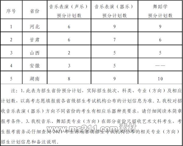 3.我校的音樂(lè)表演專(zhuān)業(yè)分聲樂(lè)、器樂(lè)兩個(gè)招生方向。招收的聲樂(lè)方向考生學(xué)校僅以美聲、民族唱法安排教學(xué);招收的器樂(lè)方向考生僅限統(tǒng)考主專(zhuān)業(yè)樂(lè)器種類(lèi)為琵琶、二胡、中阮、古箏、竹笛、揚(yáng)琴、小提琴、大提琴、低音提琴、薩克斯、鋼琴的考生。其中,古箏、二胡只招收湖南省、河北省生源考生;竹笛、薩克斯只招收河北省、甘肅省生源考生。我校音樂(lè)、舞蹈類(lèi)專(zhuān)業(yè)(方向)在部分省份只招收藝術(shù)文科考生,考生報(bào)考前務(wù)必仔細(xì)查閱2021 年生源地省級(jí)招生考試機(jī)構(gòu)公布的相關(guān)專(zhuān)業(yè)(方向)招生計(jì)劃信息和備注說(shuō)明。