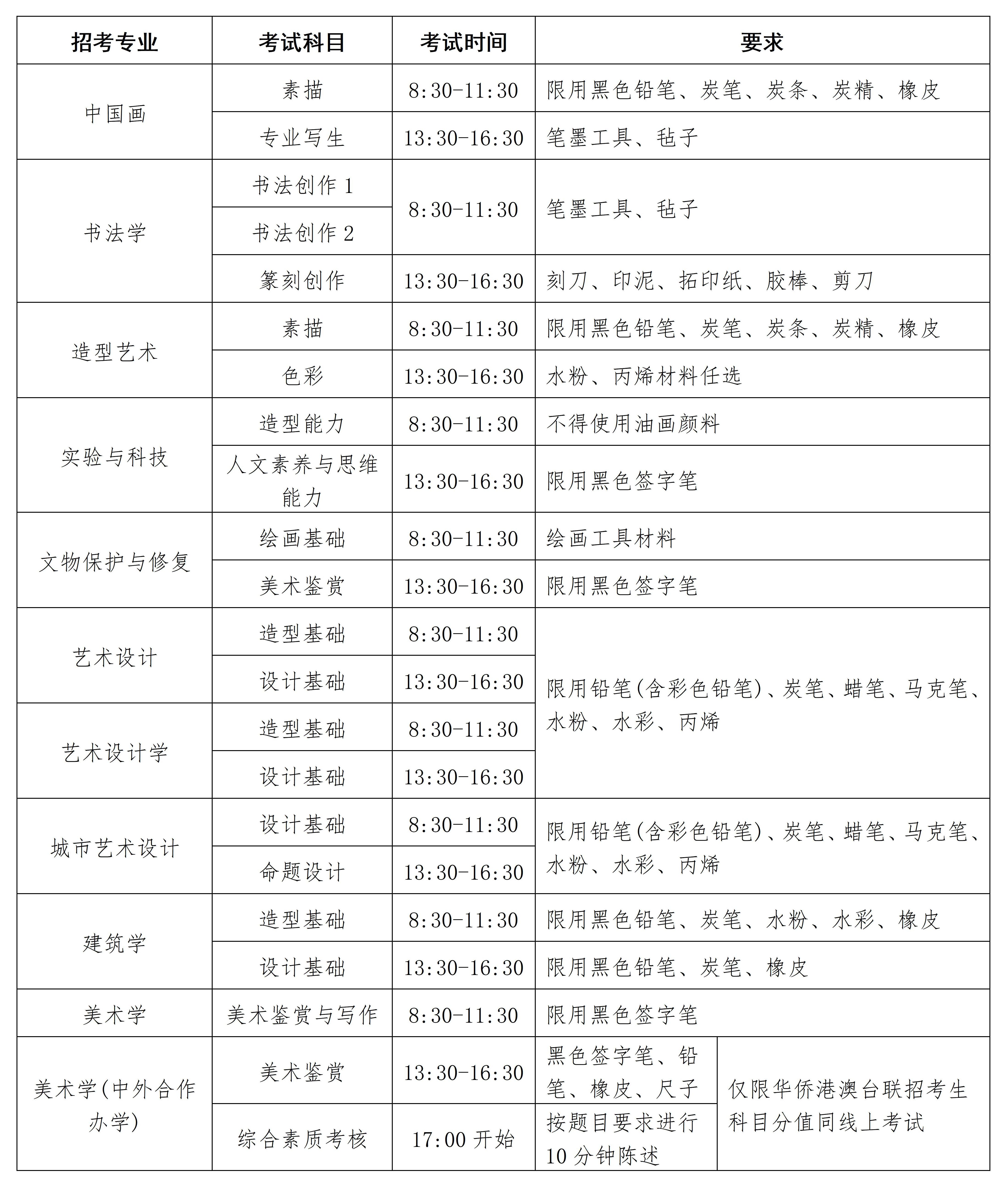 (1)中國畫、書法學(xué)、造型藝術(shù)、實(shí)驗(yàn)與科技、文物保護(hù)與修復(fù)、藝術(shù)設(shè)計(jì)、城市藝術(shù)設(shè)計(jì)專業(yè)考生文化課成績(jī)不低于生源省市普通類專業(yè)本科(文/理)批次錄取控制分?jǐn)?shù)線。
