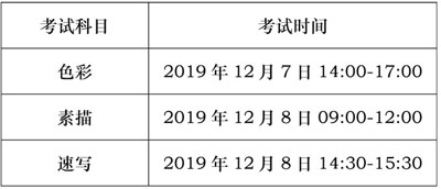 1、美術(shù)與設(shè)計(jì)類專業(yè)統(tǒng)考時(shí)間由原定2019年11月30日、2019年12月1日調(diào)整為2019年12月7日、8日。調(diào)整后的時(shí)間安排為:2019年12月7日11:00至12:00考生到考點(diǎn)熟悉考場(chǎng),2019年12月7日下午、2019年12月8日全天考試。