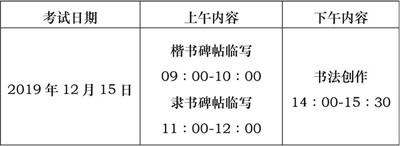 2、書法學(xué)(毛筆)專業(yè)統(tǒng)考時(shí)間由原定2019年12月8日調(diào)整為2019年12月15日。調(diào)整后的時(shí)間安排為:2019年12月14日16:00至20:00考生到考點(diǎn)熟悉考場(chǎng),2019年12月15日全天考試。