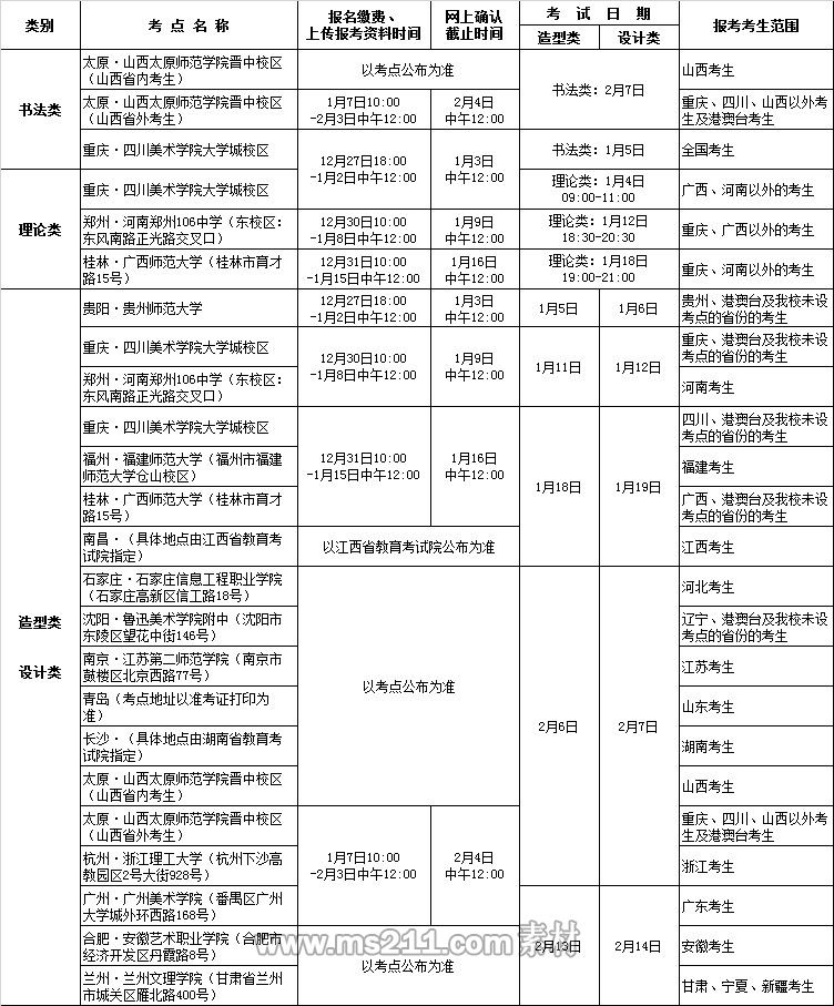 其中,報考書法類、造型類、設計類的四川考生,只能參加重慶考點(1月5日和1月18-19日)的考試。